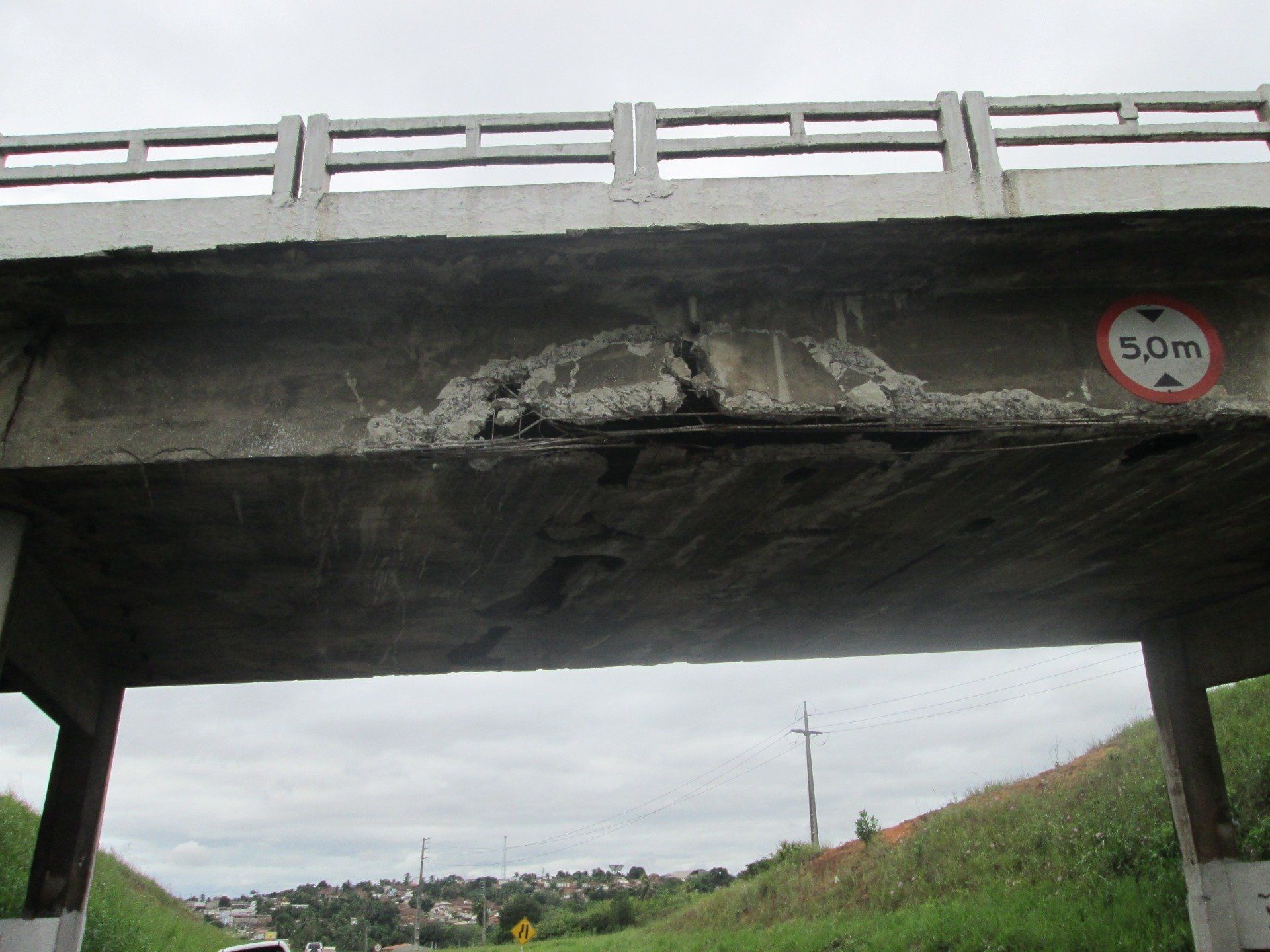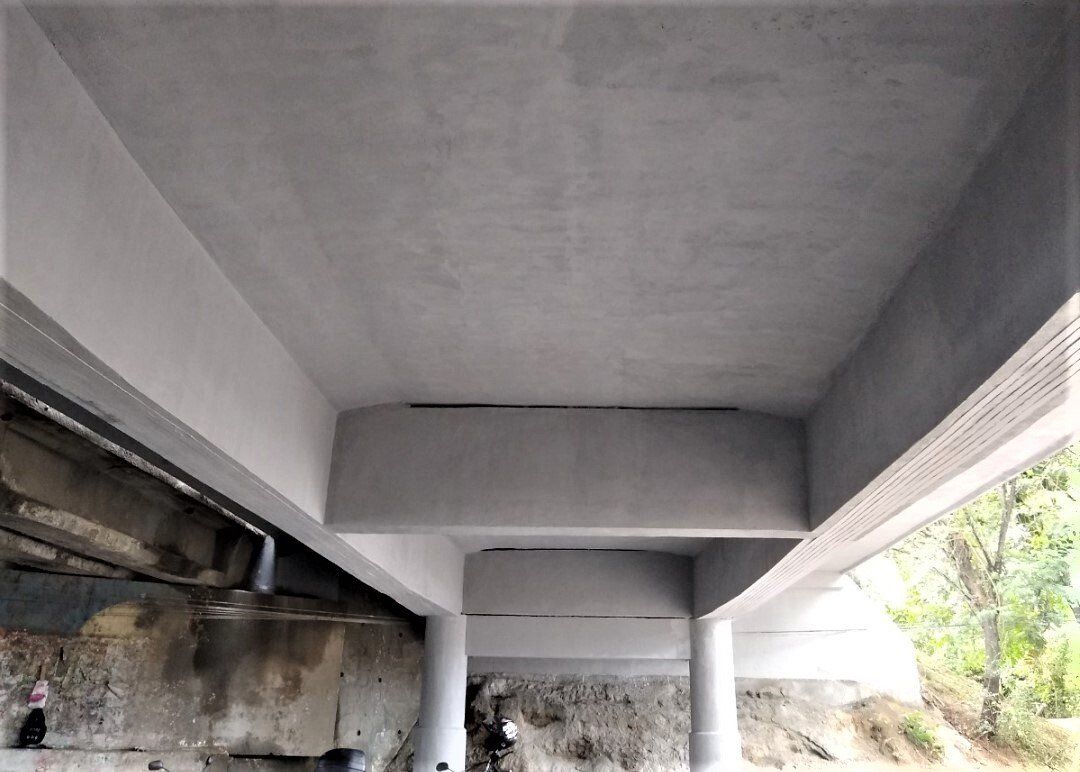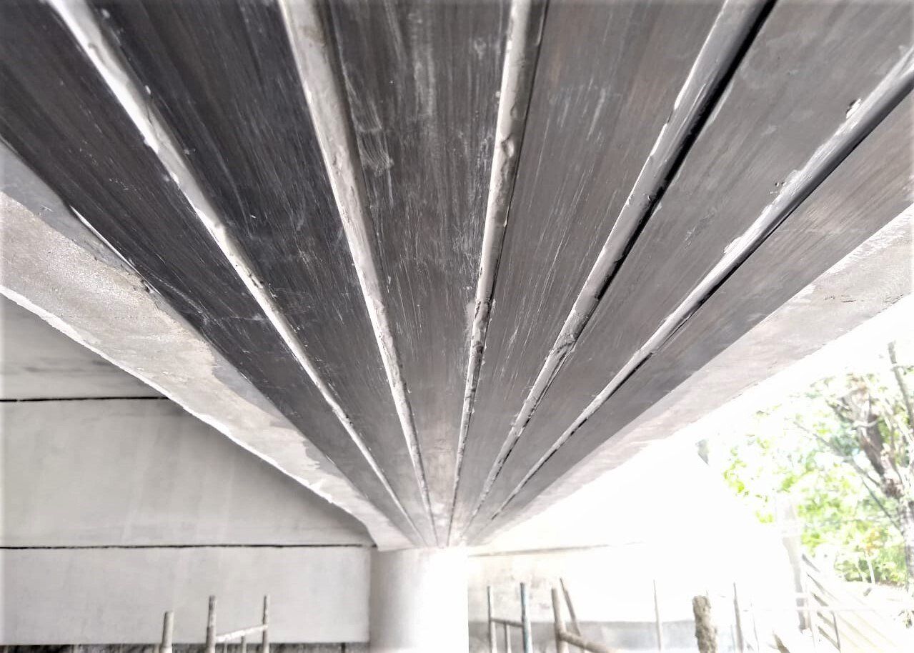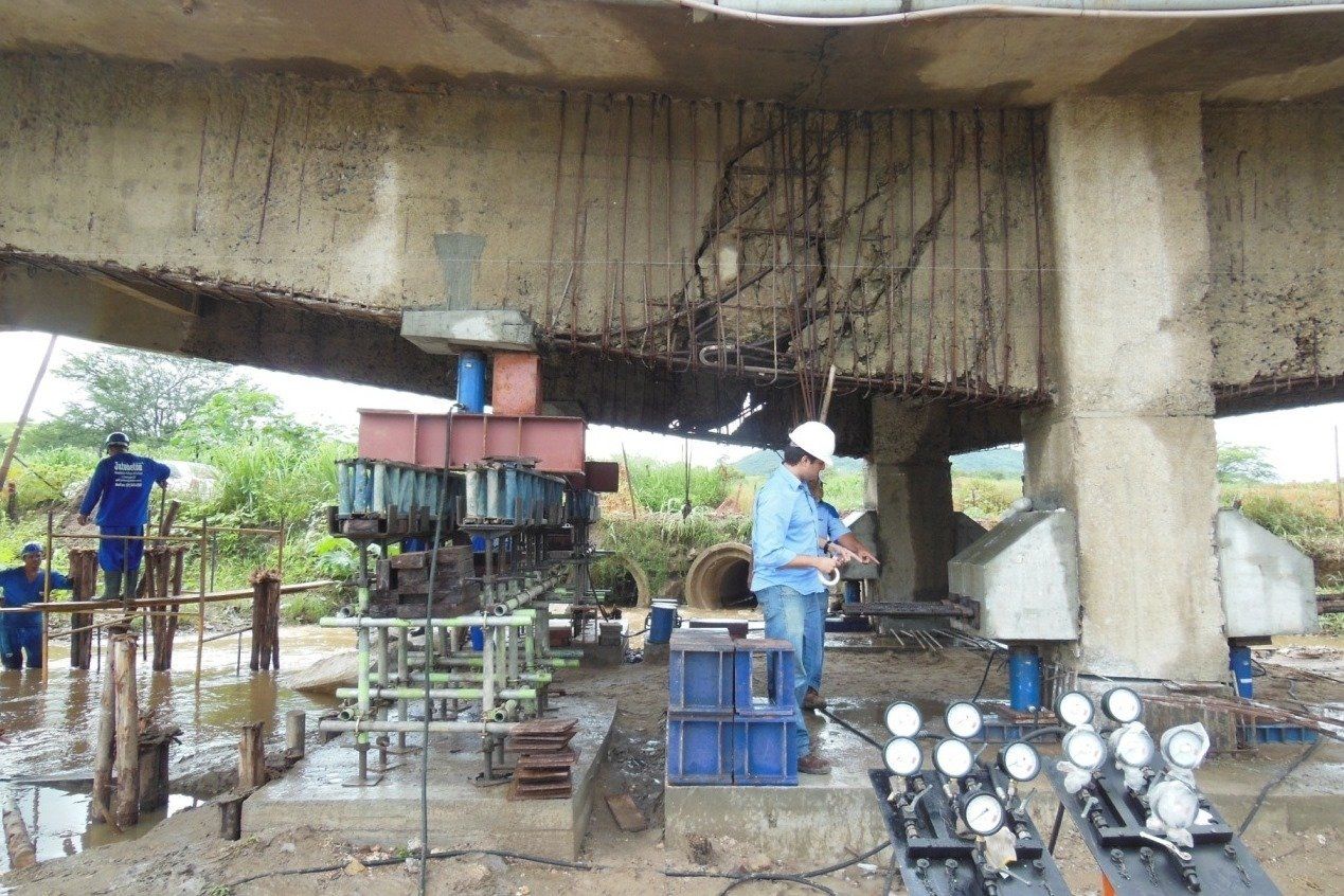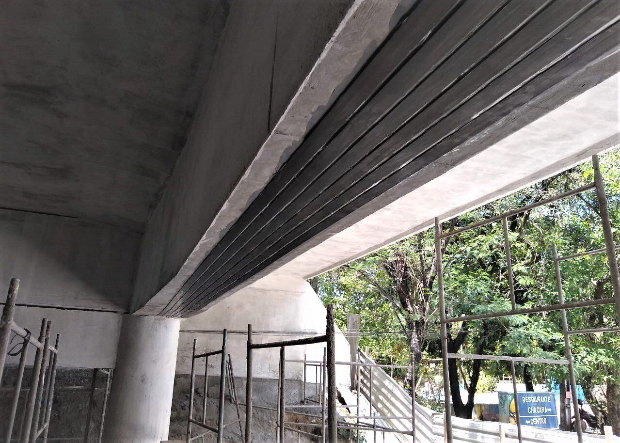 Viaduto na Rodovia PE-60 no Município do Cabo de Santo Agostinho. Reforço estrutural das vigas principais em concreto armado e lâminas de fibra de carbono em função da limitação do gabarito vertical sob o viaduto (Jatobeton / DER-PE)