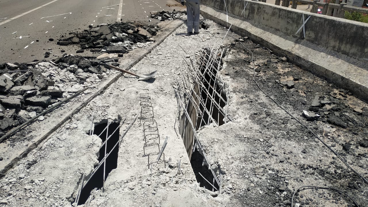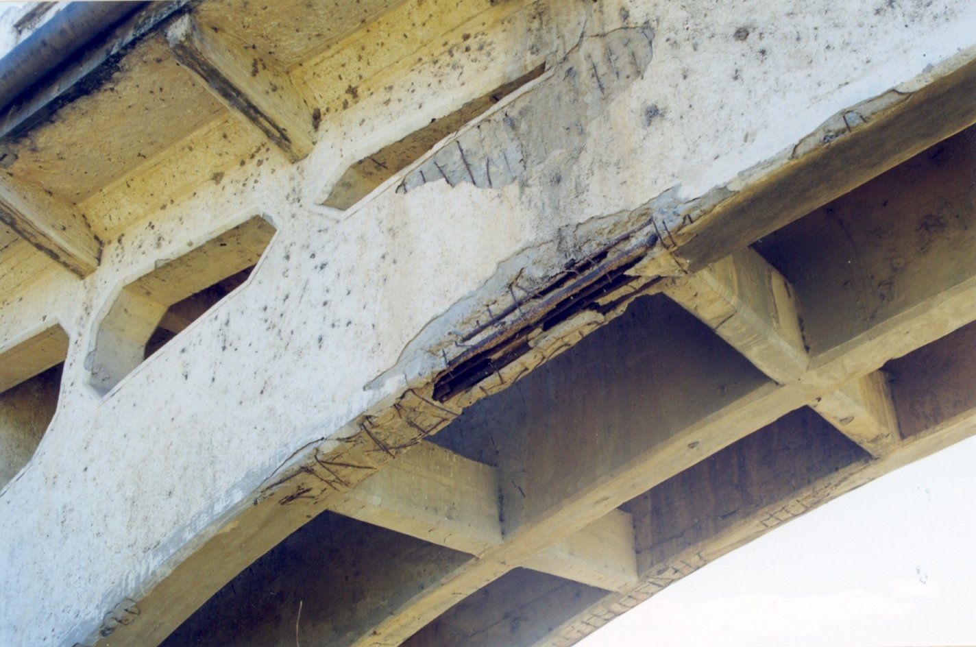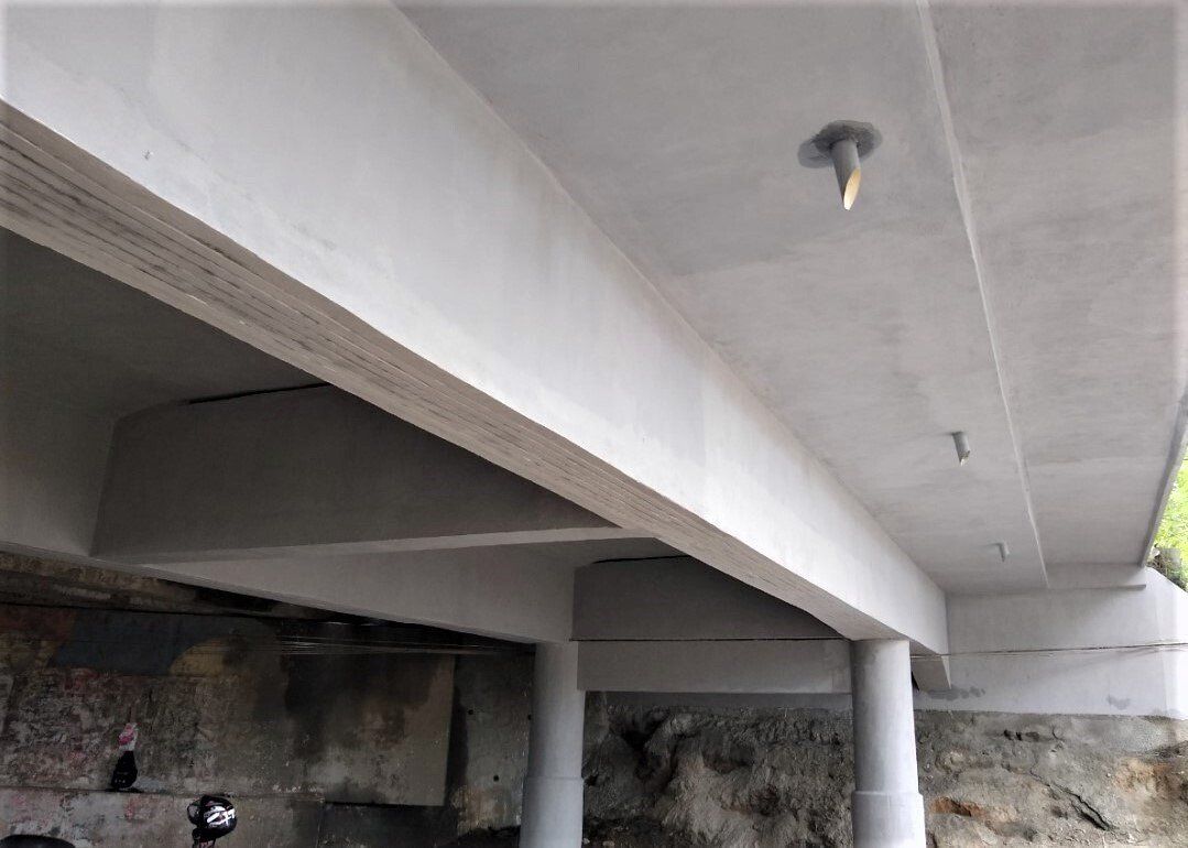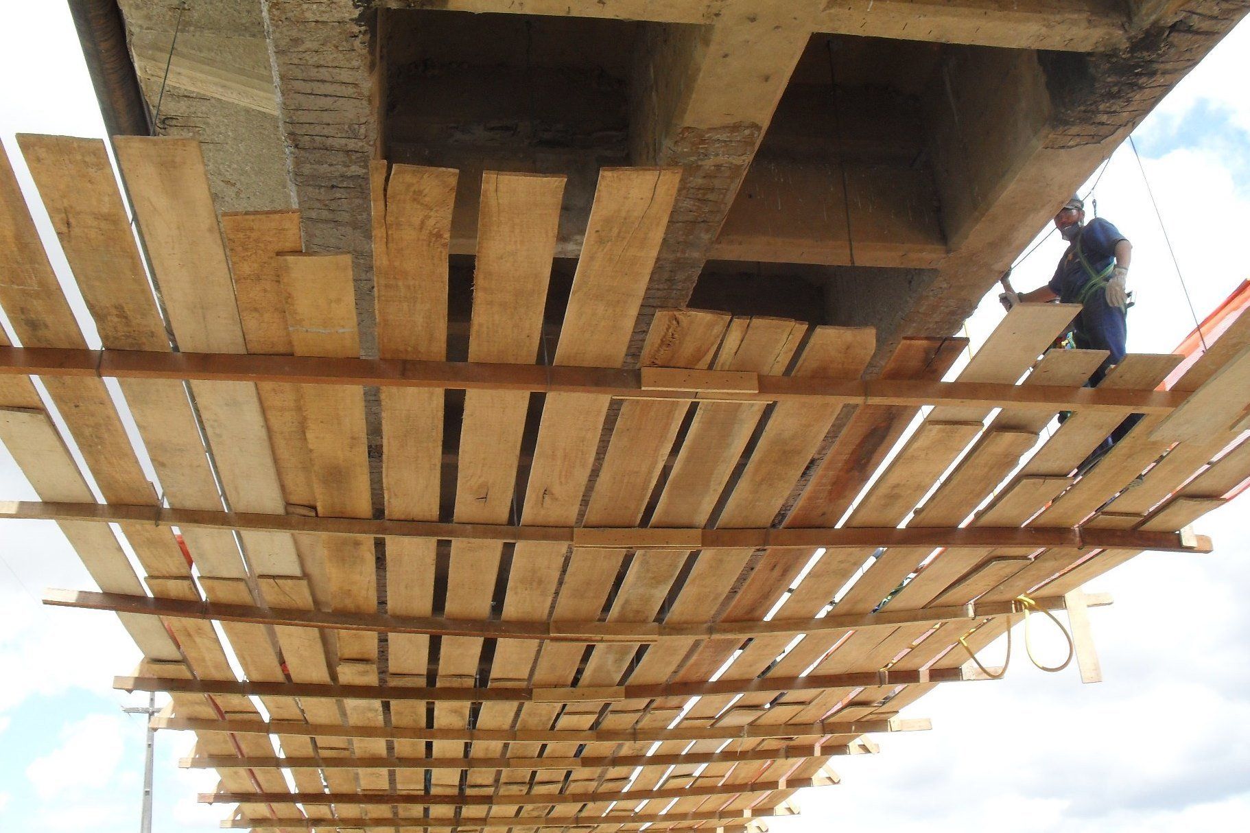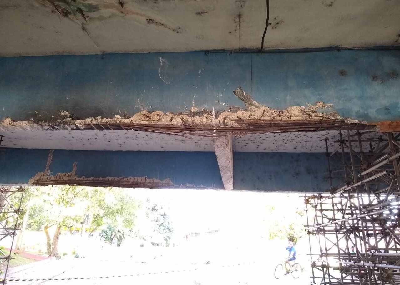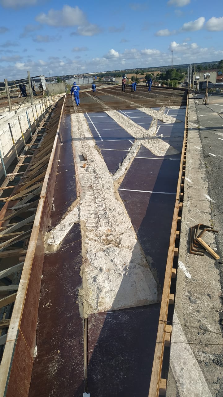 Viaduto na Rodovia PE-60 no Município do Cabo de Santo Agostinho. Reforço estrutural das vigas principais em concreto armado e lâminas de fibra de carbono em função da limitação do gabarito vertical sob o viaduto (Jatobeton / DER-PE)