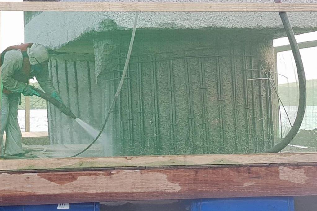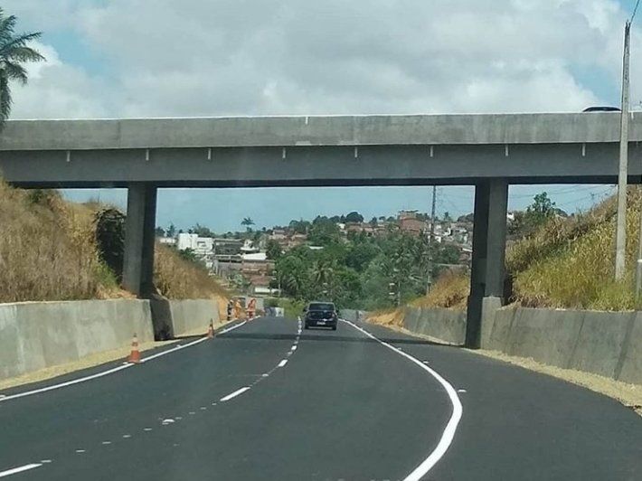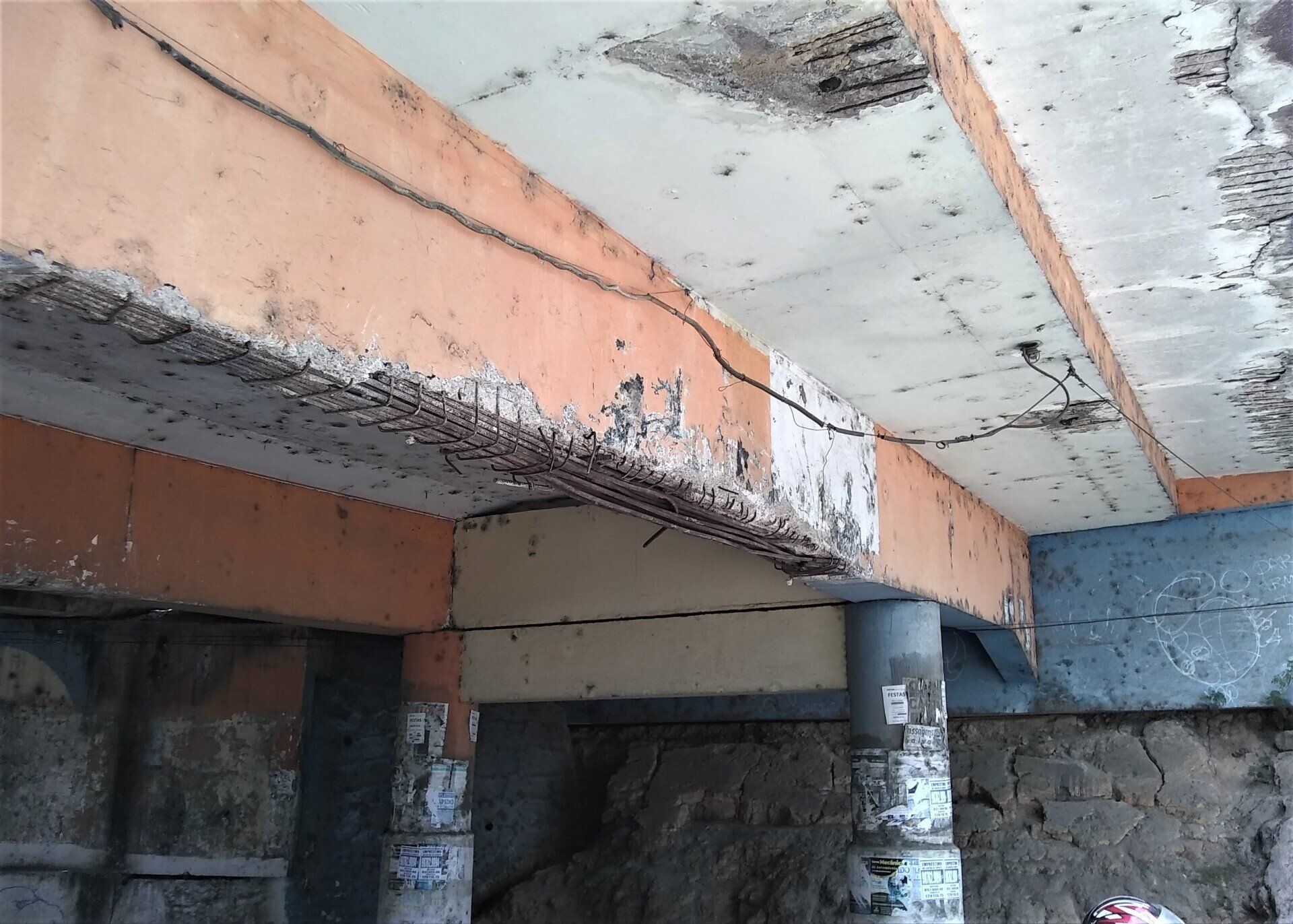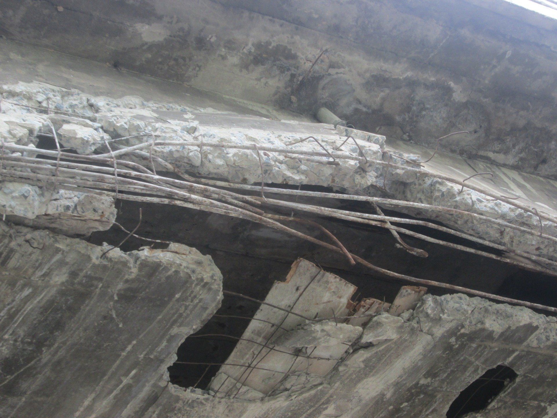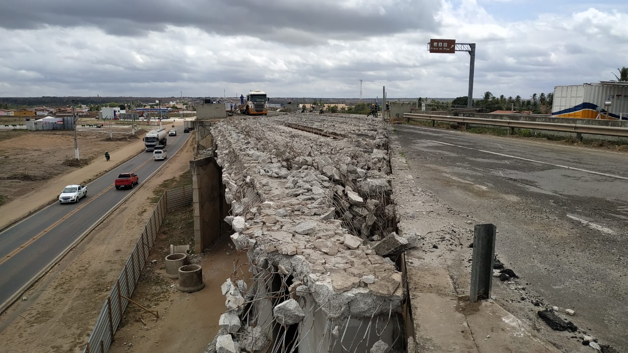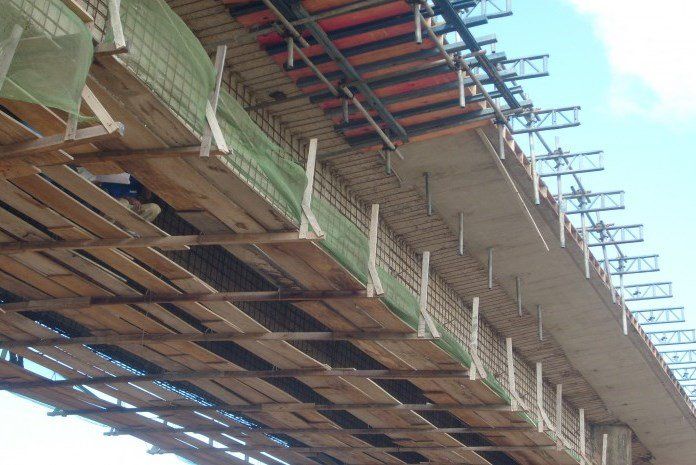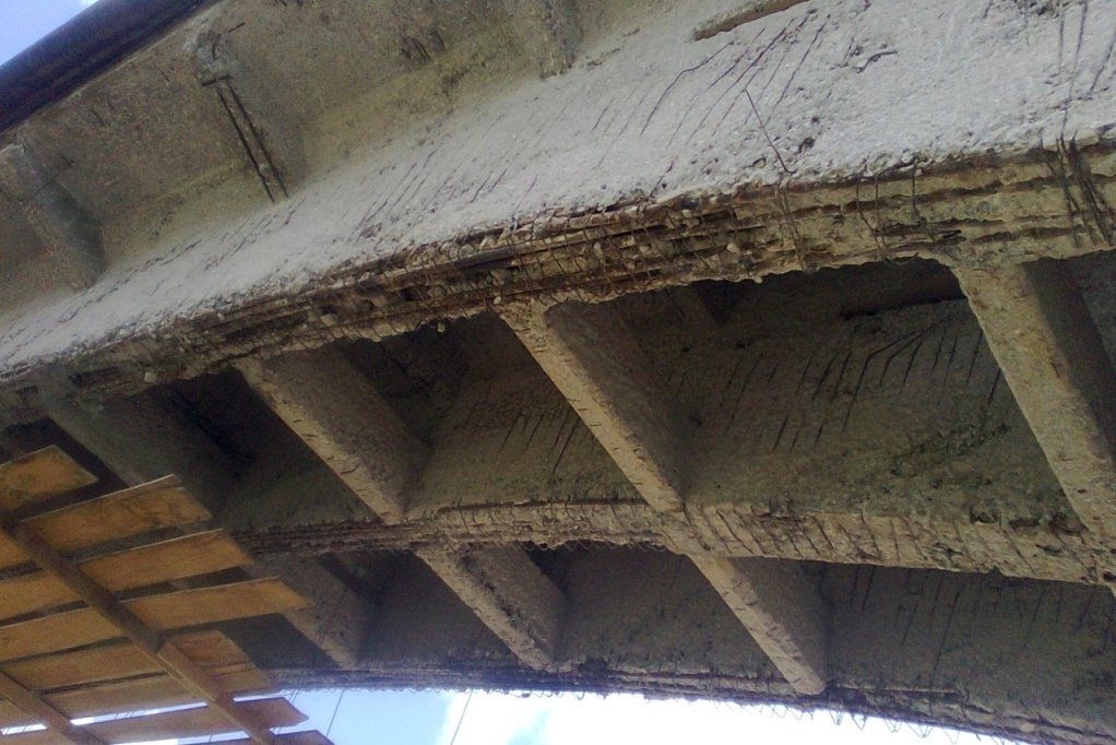 Viaduto na Rodovia PE-60 no Município do Cabo de Santo Agostinho. Reforço estrutural das vigas principais em concreto armado e lâminas de fibra de carbono em função da limitação do gabarito vertical sob o viaduto (Jatobeton / DER-PE)